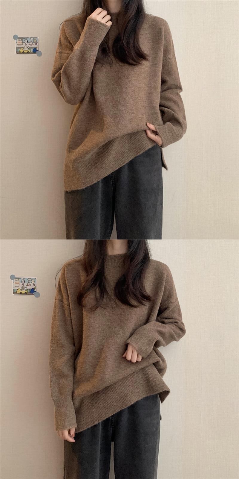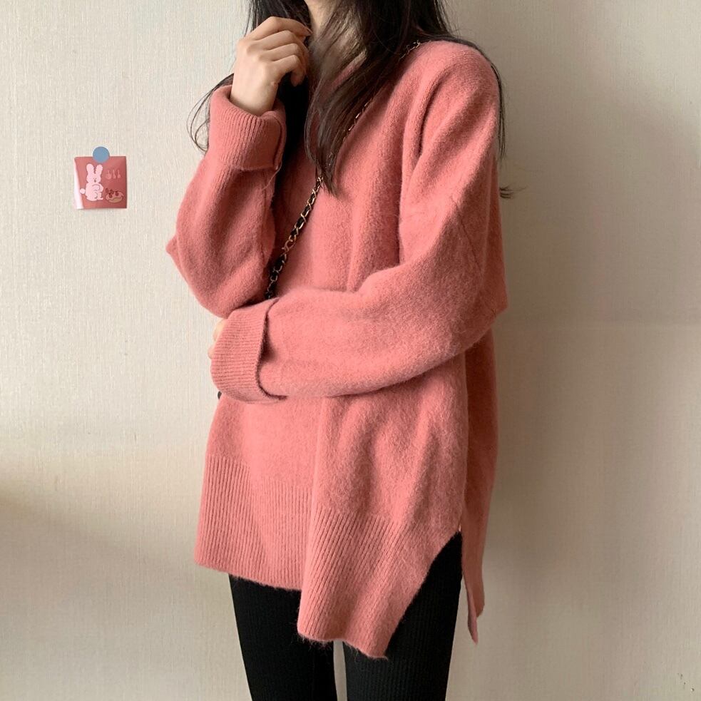 スリットオータムウィンタープルオーバー セーター シャツ ルーズソリッド カラートップス ロング 秋物 冬物 ソリッドカラー kumikum32524883388
