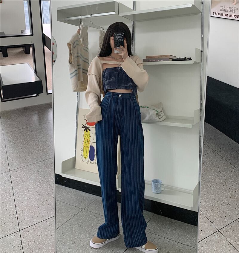 ウィンターロング薄手ブルールーズジーンズ ハイウェスト 冬物 ストライプ kumikum2514035279