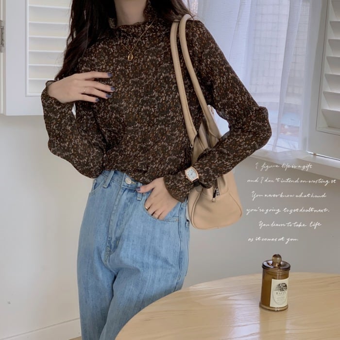 フローラルシャツ スタンダードスリムシフォントップス ロング レトロ スプリング 春物 花柄 kumikum83142584655