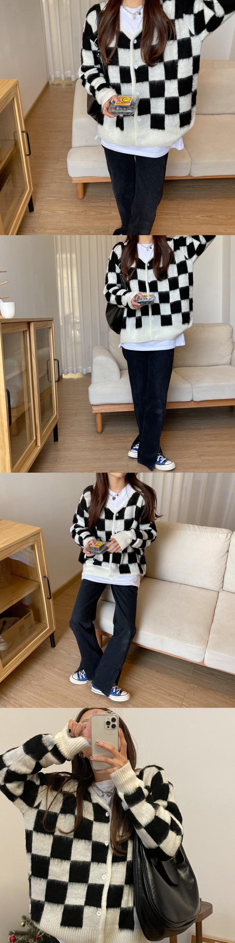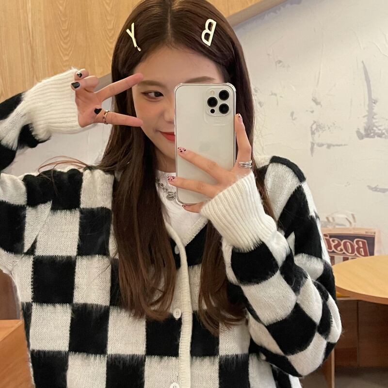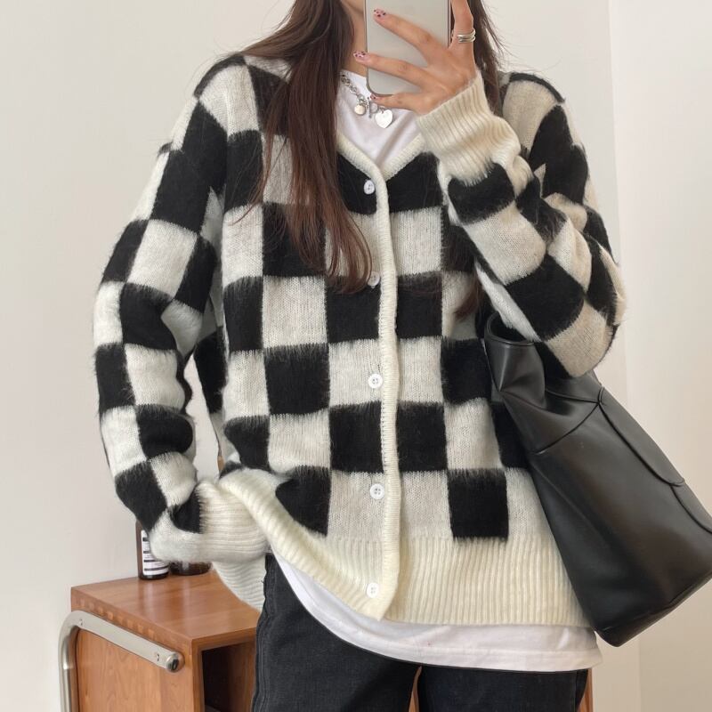 スタンダードカラー格子柄Vネックセーター カーディガンジャケット ウィンタールーズ ロング レトロ 冬物 kumikum10651070792