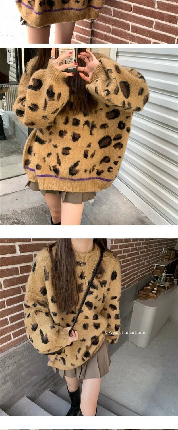 スタンダードレオパードプリント柄ラウンドネックセーター ウィンタールーズプルオーバー ロング レトロ 冬物 Oネック kumikum13087277631
