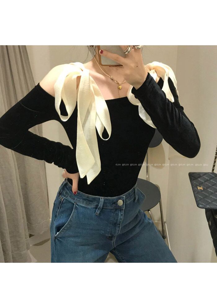 スプリングシャツ スタイルベルベットトップス ロング リボン レース 春物 レースアップ kumikum49921878687