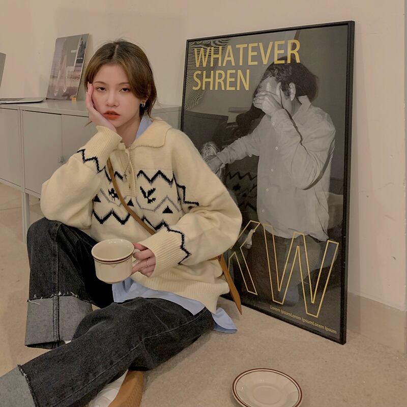 スプリングスタイルジャカードセーター プルオーバー ルーズトップス ロング 春物 kumikum43730941024