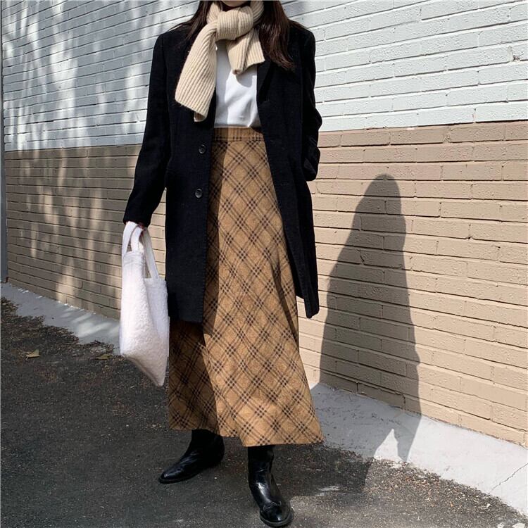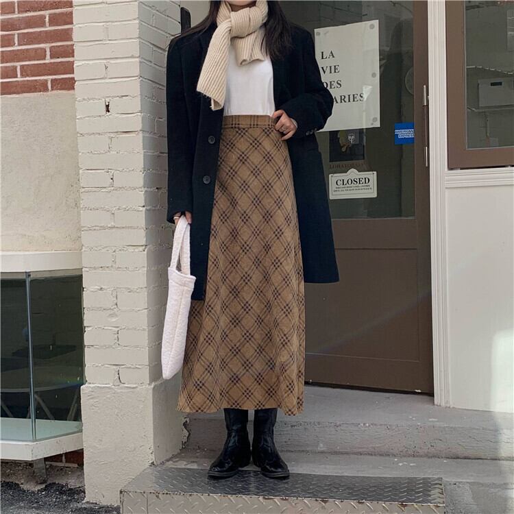 ウィンターハイウェストウェストスリム格子柄ロングスカート スタンダードAライン レトロ 冬物 kumikum58326427289