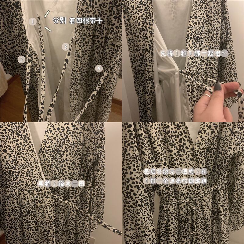 スプリングスタイルレオパードプリント柄シフォンドレス スタンダードVネックウェストスカート ロング レトロ 春物 kumikum31511143557