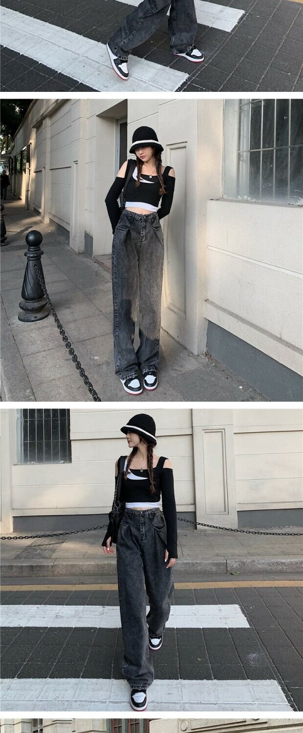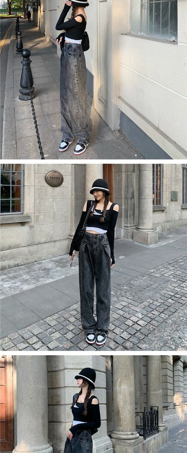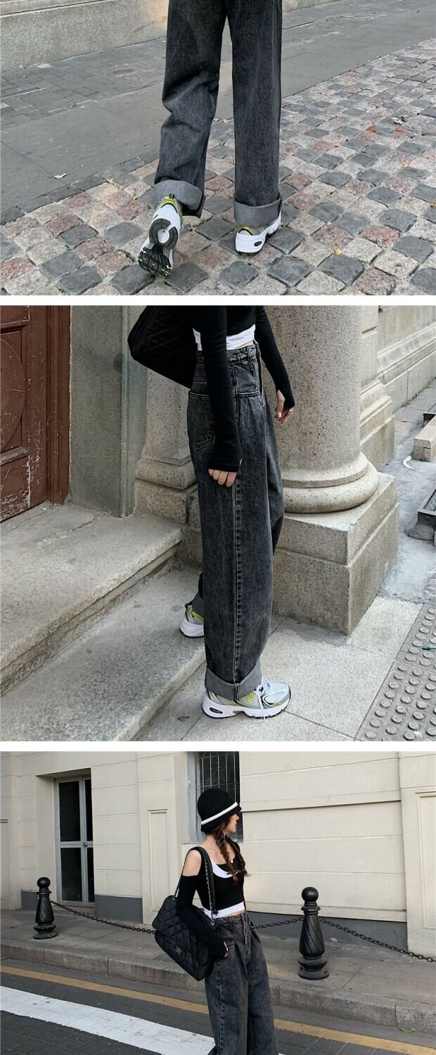 スタンダードブラックグレージーンズ レディースウィンターパンツ ハイウェストウェストスリムルーズワイドレッグ レトロ 冬物 ワイドパンツ kumikum1902154079