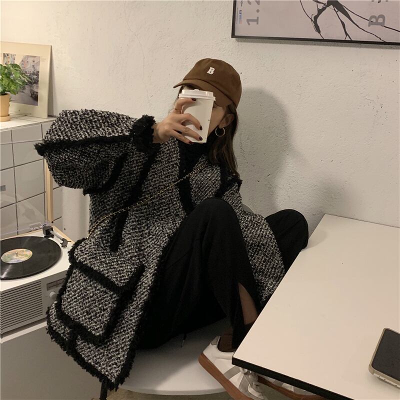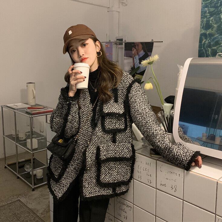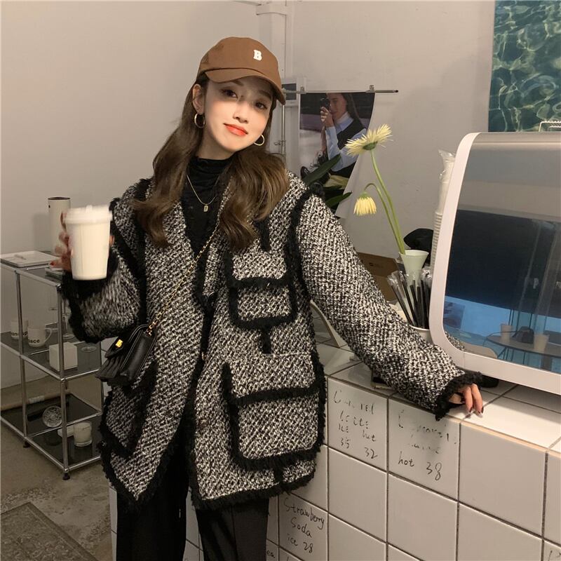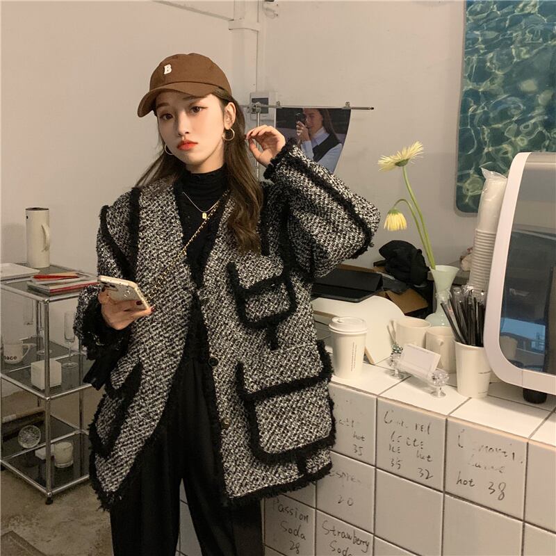 スタンダードツィードジャケット レディースウィンタールーズVネックレッド格子柄 レトロ 冬物 kumikum4899509292