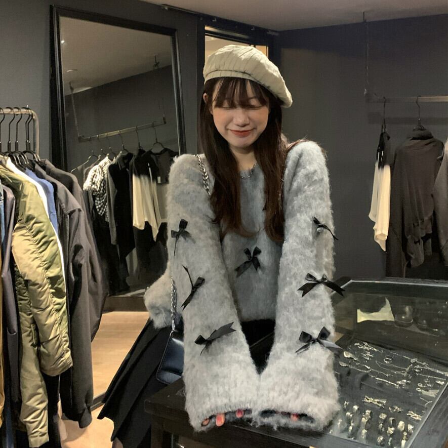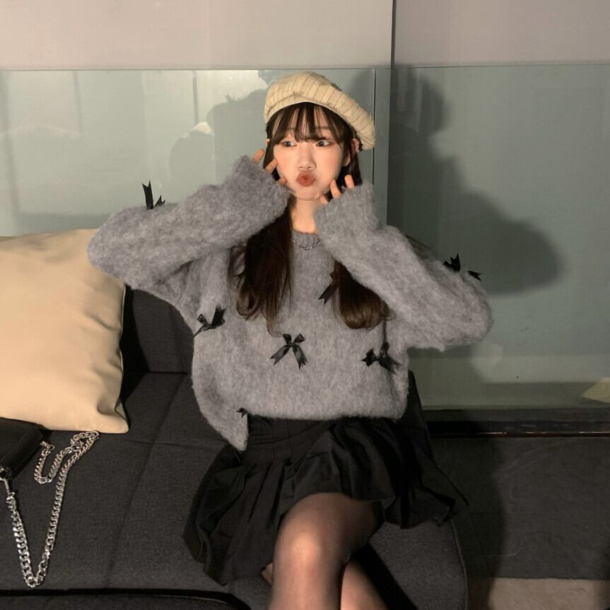スタンダードルーズセーター レディーススプリングラウンドネックプルオーバー トップス リボン レトロ 春物 Oネック kumikum44157627872