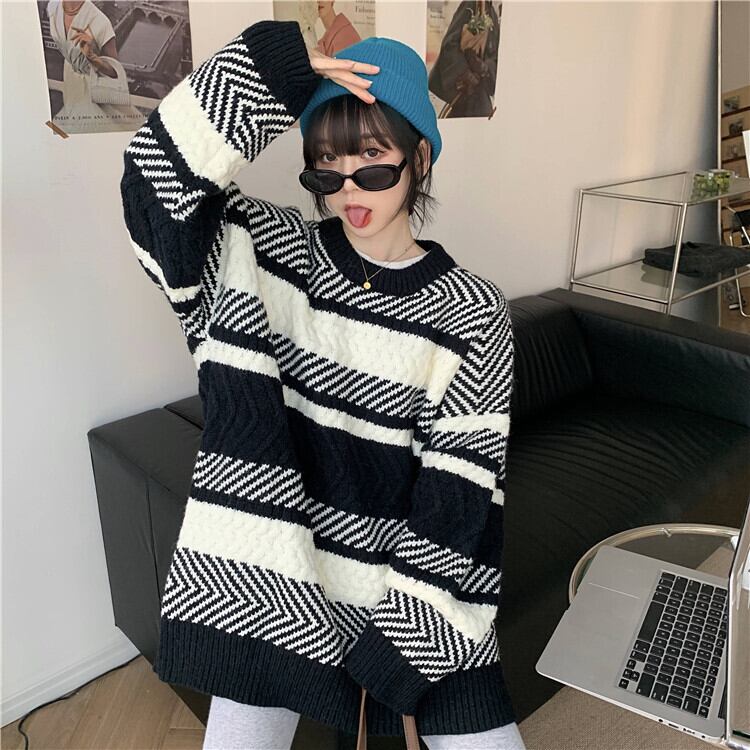 スタンダードストライプラウンドネックプルオーバー セーター レディースウィンタールーズシャツ ロング レトロ 冬物 Oネック kumikum81961997319