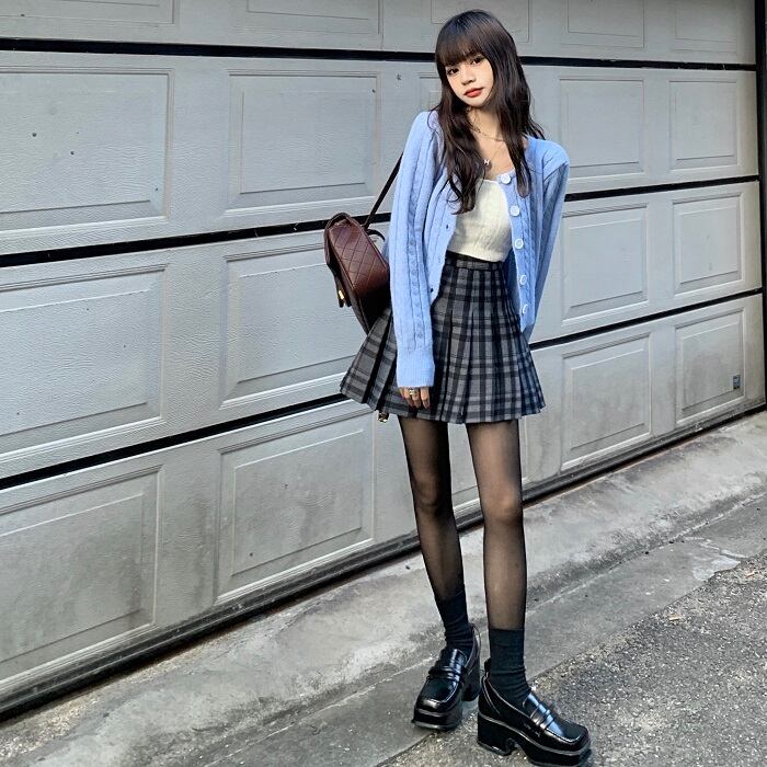 色:ブルーカーディガン,ホワイトサスペンダー,プリーツスカート