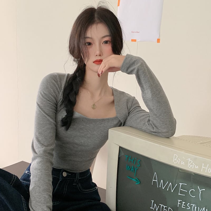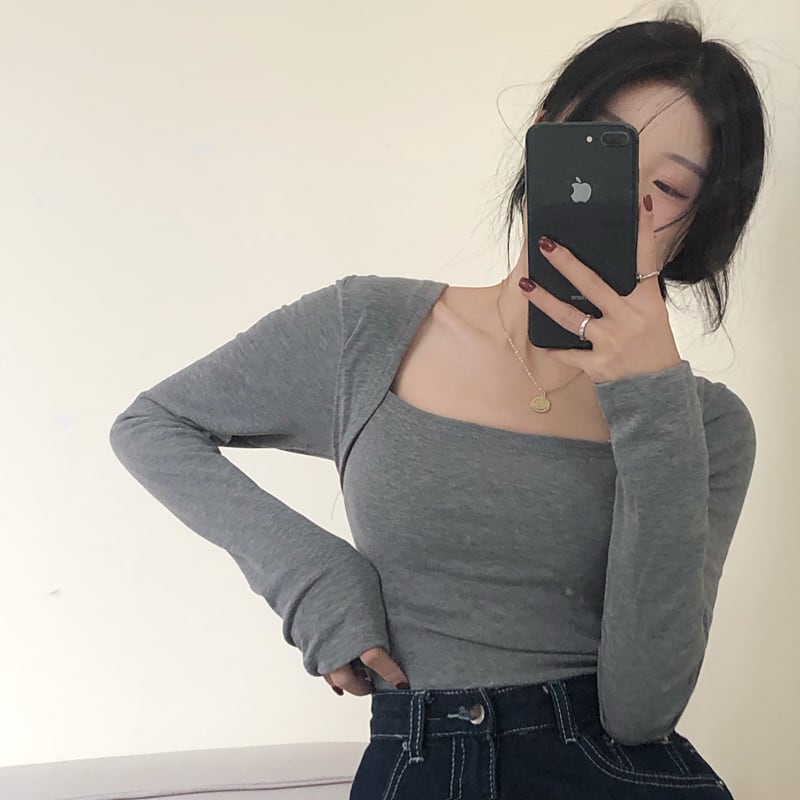 スタイルカラーソリッド シャツ スプリングスリムTシャツ ロング 春物 ソリッドカラー スクウェア kumikum67535019232