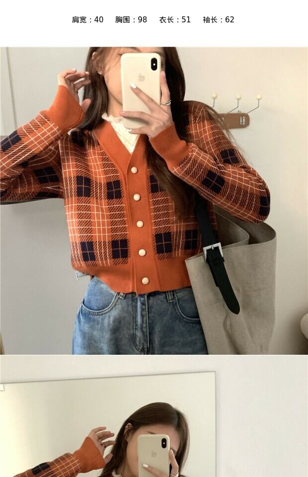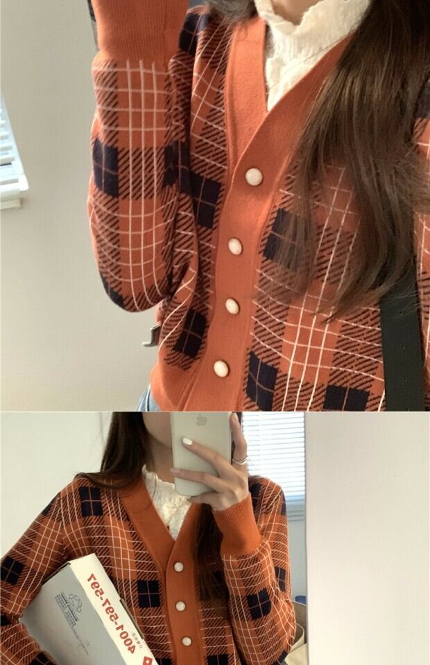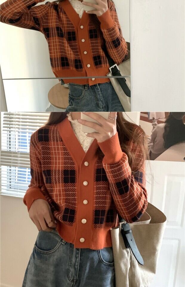 ウィンタースタンダード格子柄Vネックニットカーディガン薄手ルーズショートセーター コート レトロ 冬物 kumikum17111830283