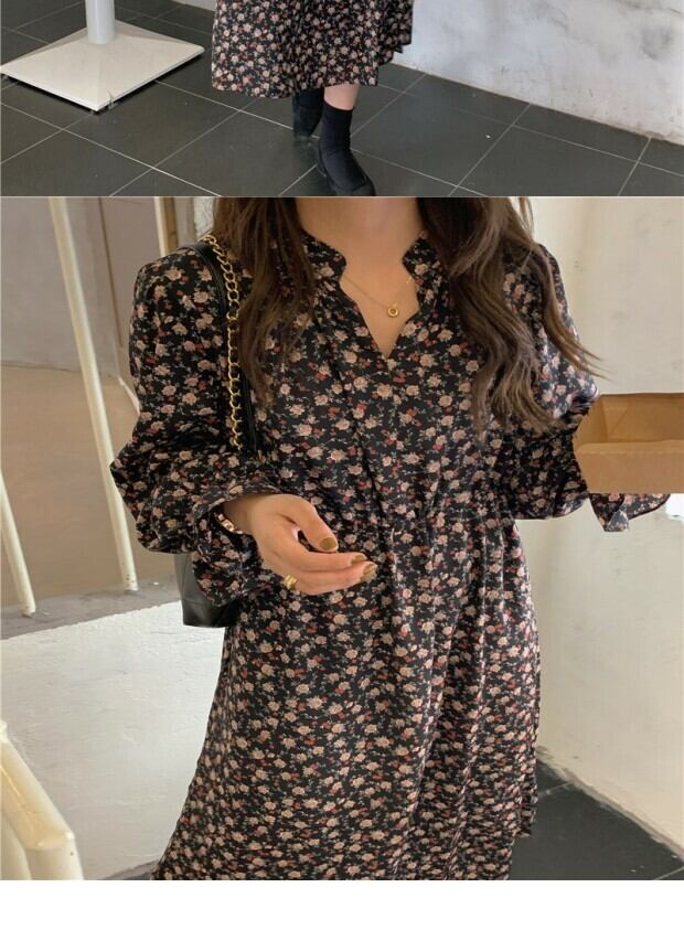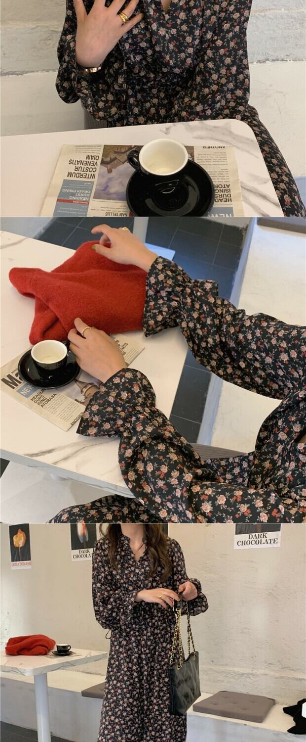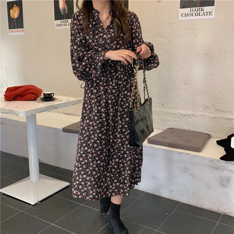 スタンダードフローラルウェストスカート ウィンターVネックシフォンドレス ロング レトロ 冬物 花柄 kumikum14848673609