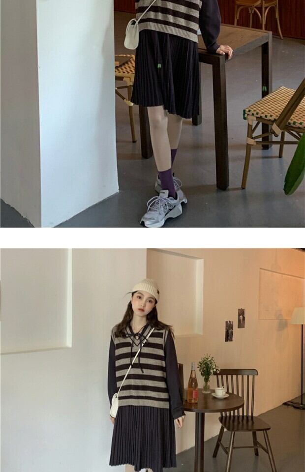 Vネックストライプニットプリーツ スプリング 春物 kumikum45068025263