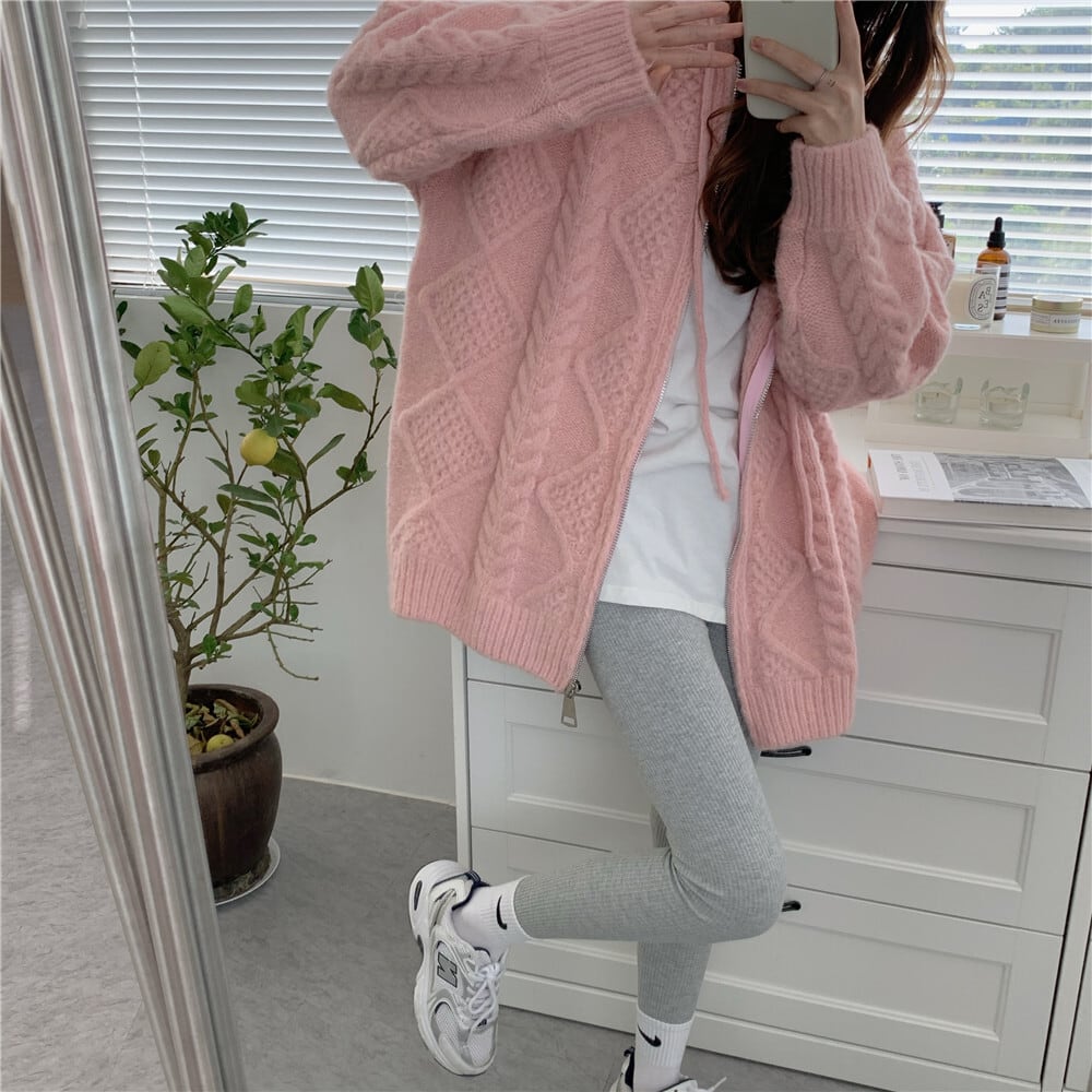 スタンダードルーズフードセーター コート オータムカーディガントップス ロング ピンク レトロ 秋物 kumikum32905806692