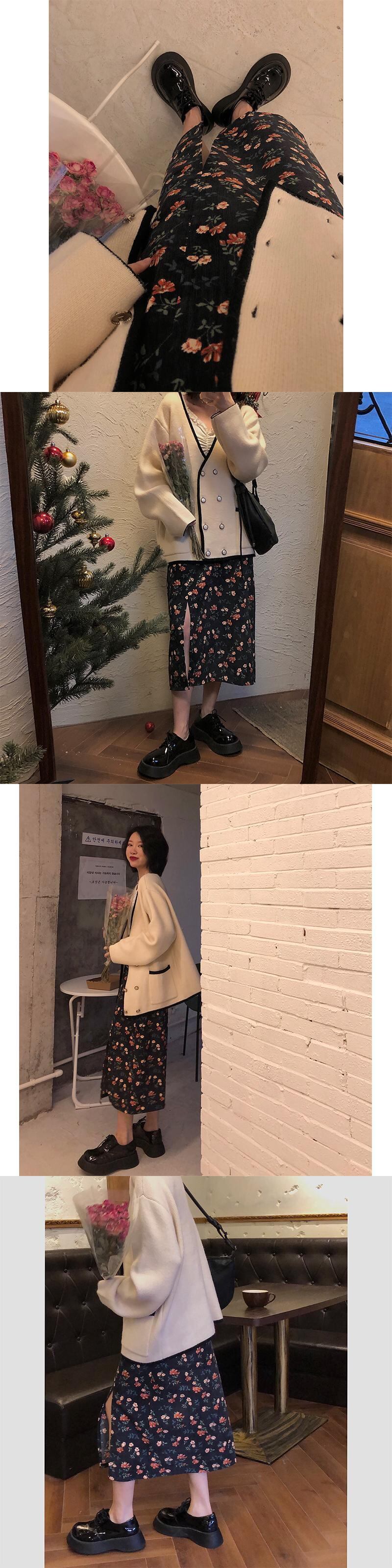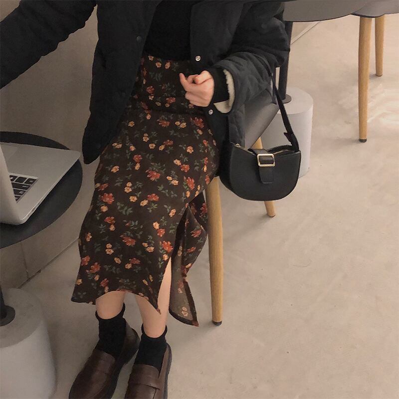 スタンダードコーデュロイフローラルスカート ウィンターハイウェストウェスト薄手Aライン レトロ 冬物 花柄 kumikum40706110629