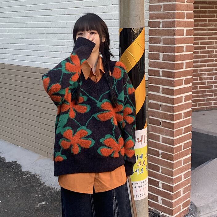 スタンダードFlowerデザイン 刺繍ルーズセーター スプリングシャツ トップス ロング レトロ 春物 フラワーデザイン kumikum17969228781