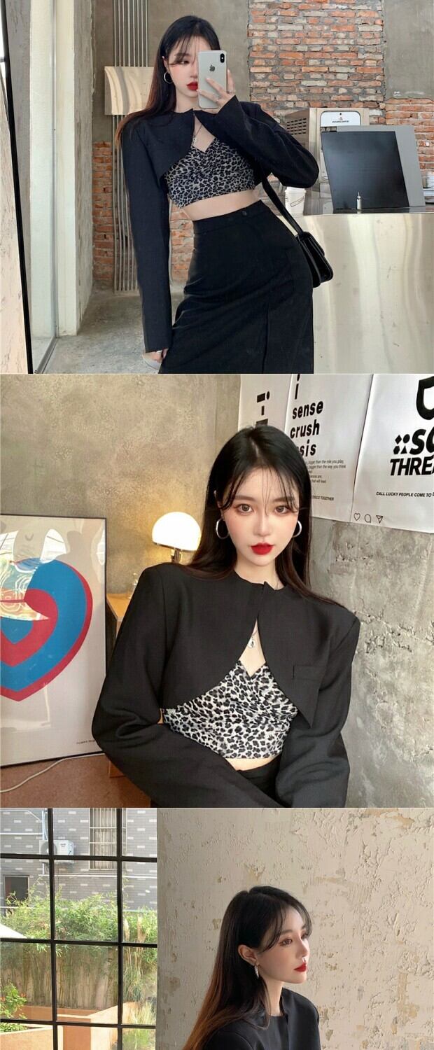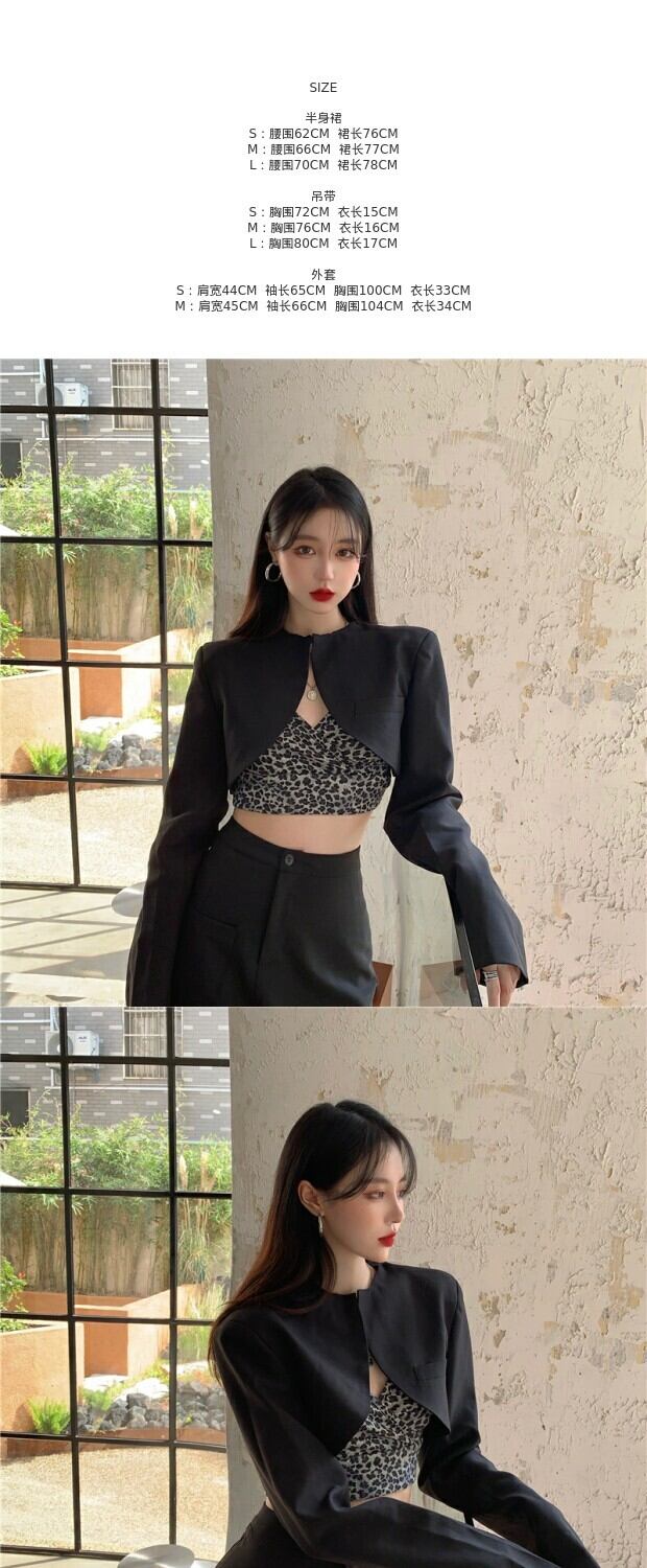 色:ヒョウストラップ,黒スカート,黒のブレザー