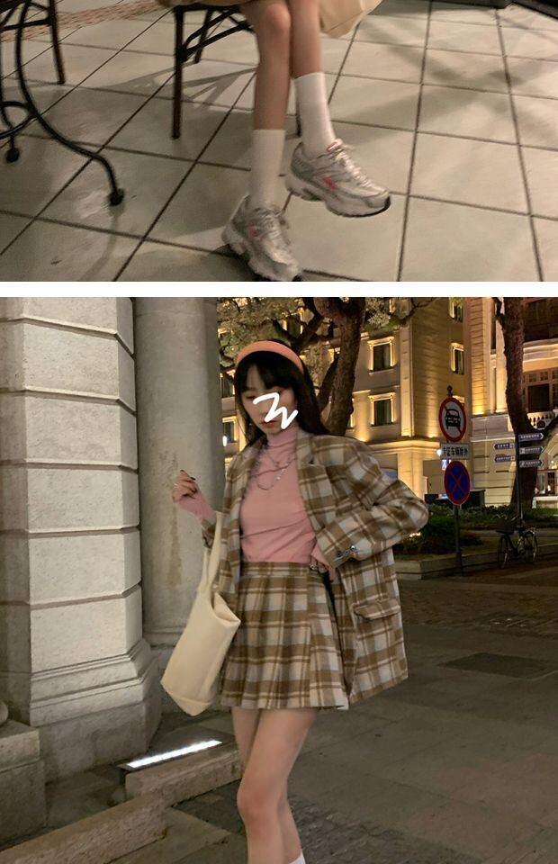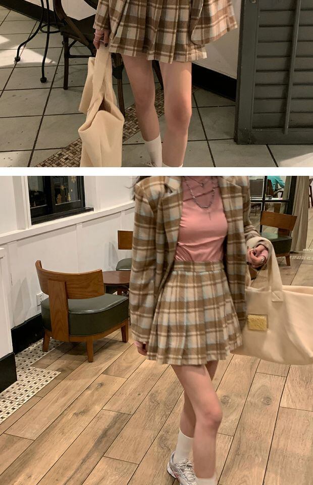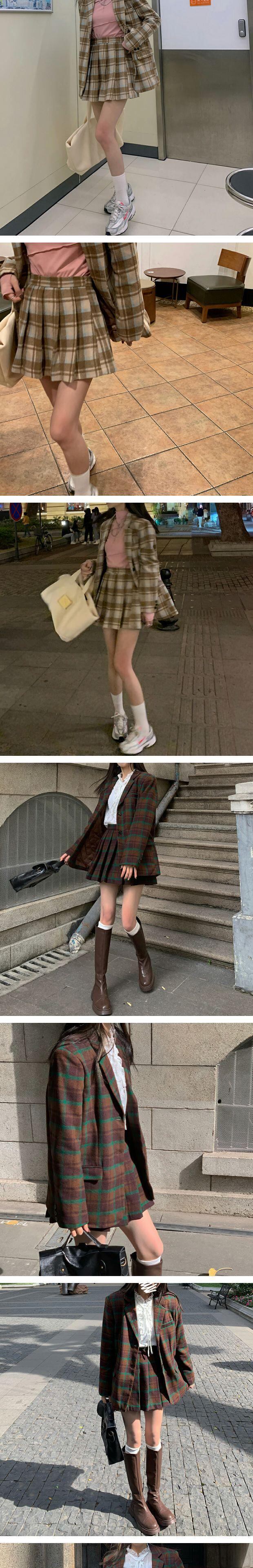 スプリングスタンダード格子柄ジャケット ハイウェストウェストプリーツスカート レトロ 春物 kumikum97863523621