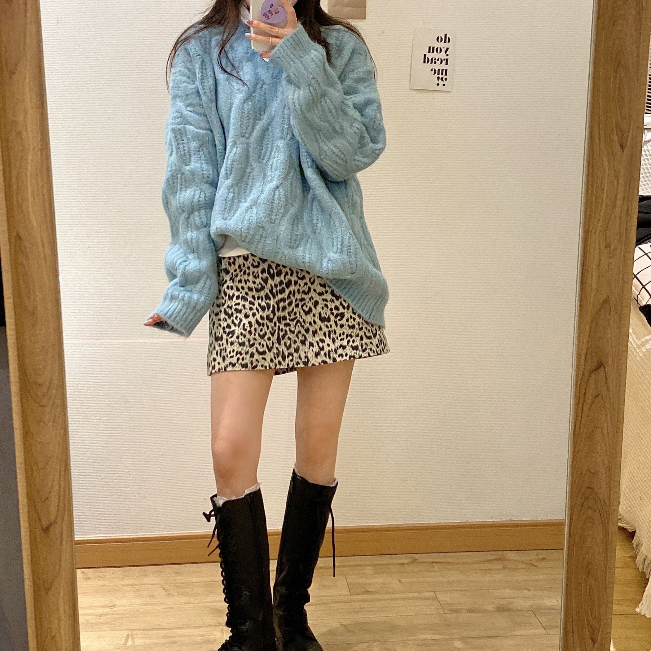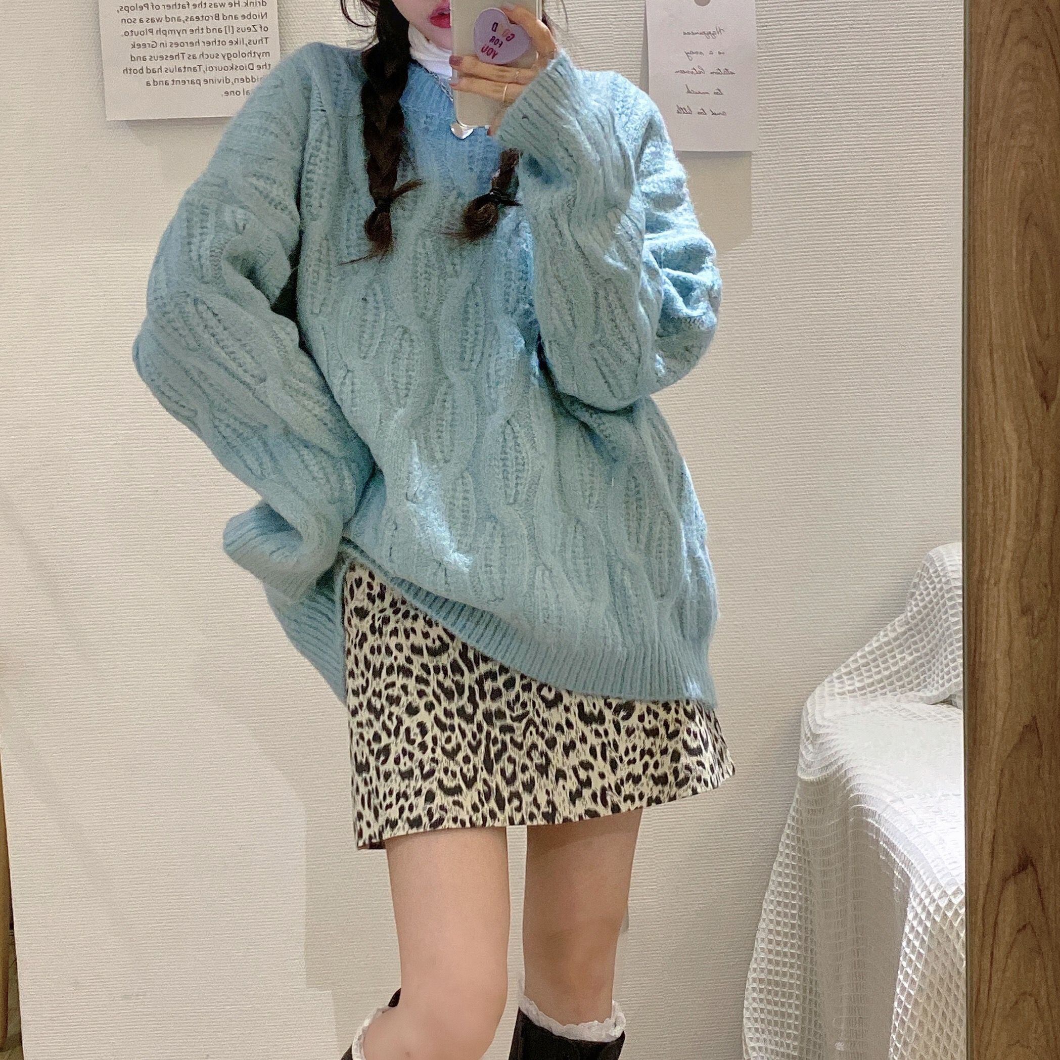 スタイルブルーラウンドネックニットセーター トップス レディースオータムウィンタールーズプルオーバー ロング 秋物 冬物 Oネック kumikum9809922575