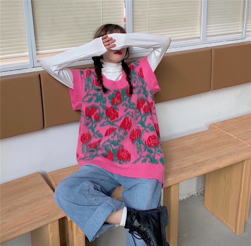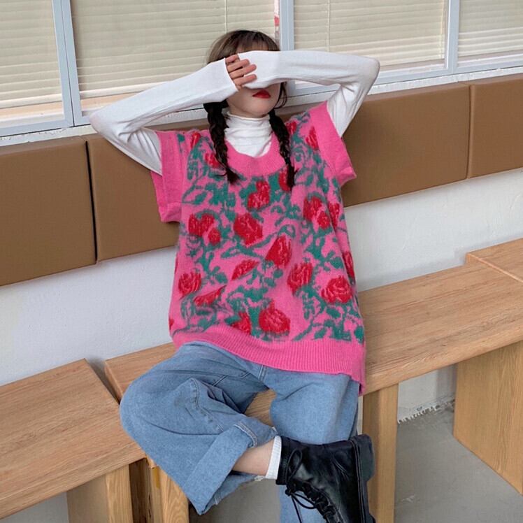 スタンダードFlowerデザイン パターンニットレディースウィンタールーズスタイルノースリーブ レトロ 冬物 フラワーデザイン kumikum61042098630