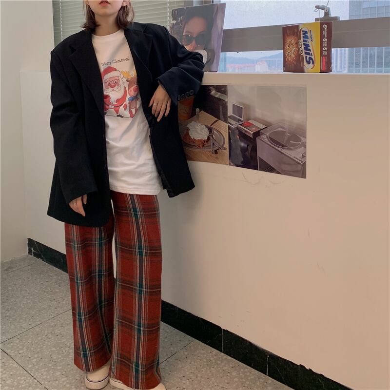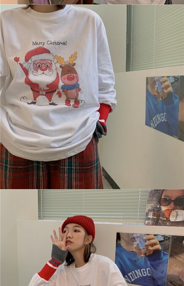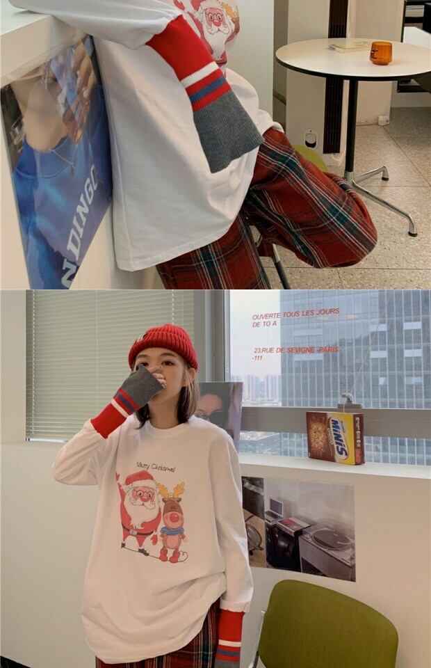 レッドプリントラウンドネックTシャツ シャツ ルーズカジュアルトップス スプリング ロング 春物 Oネック kumikum8105574550