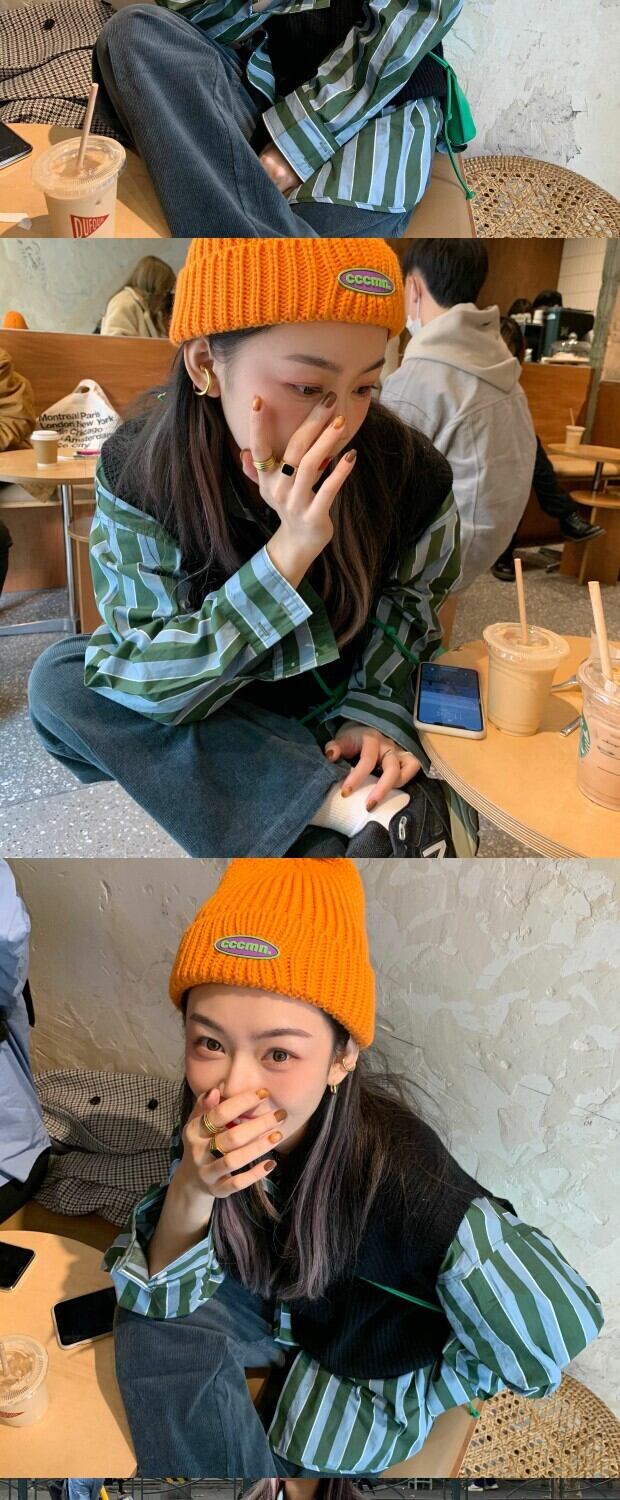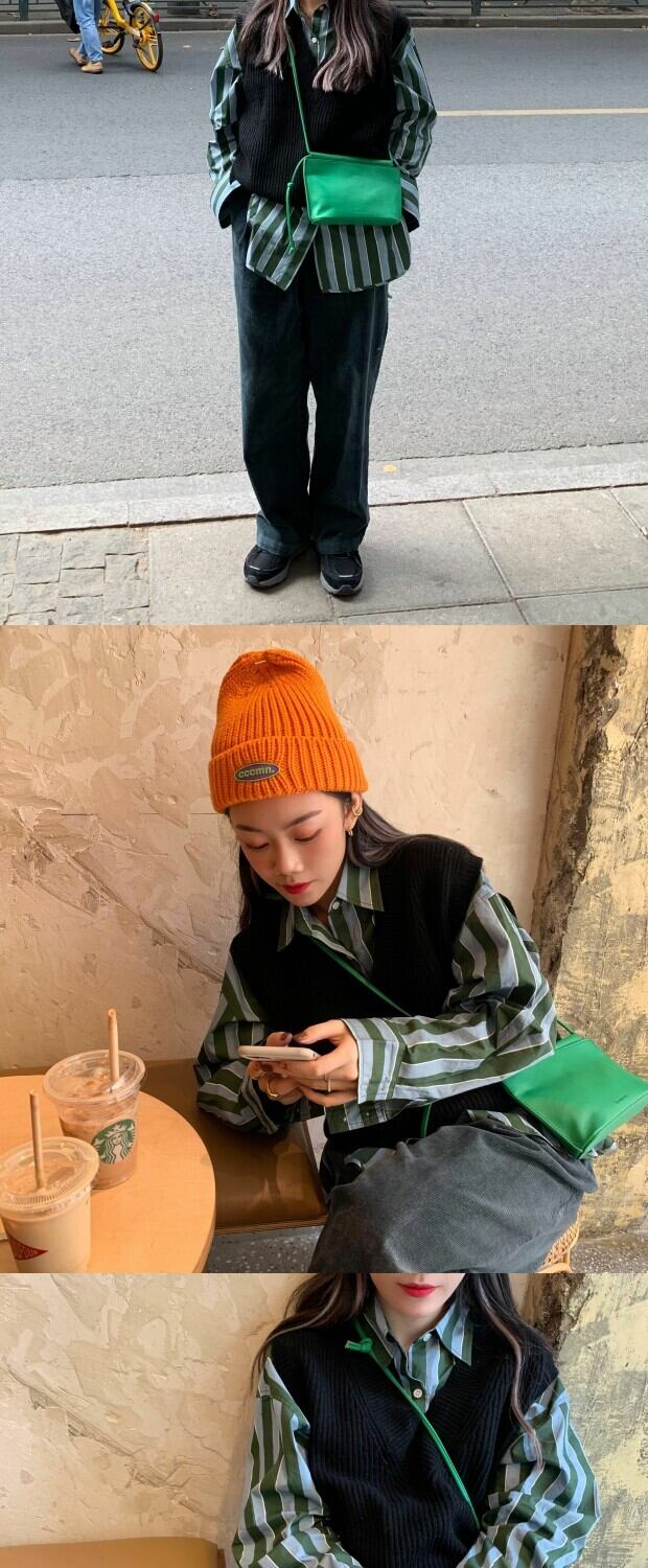色:ストライプシャツ,ベスト,グリーンコーデュロイパンツ