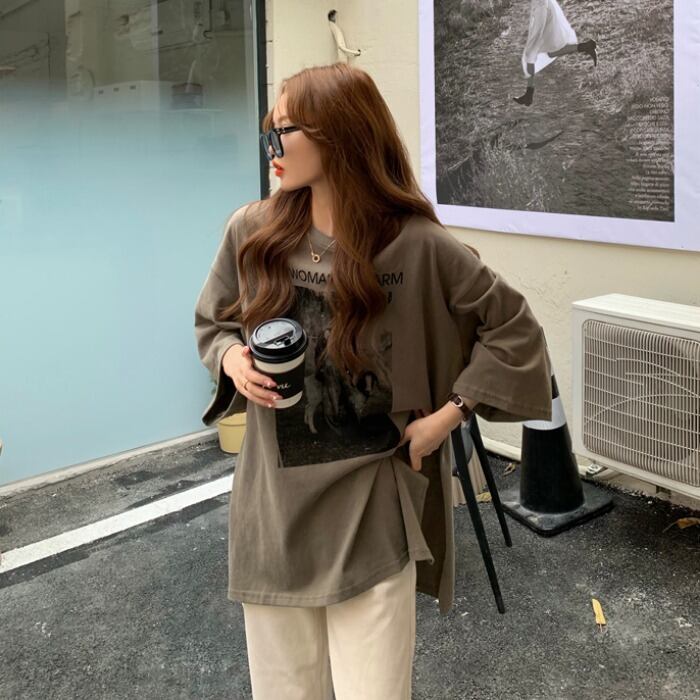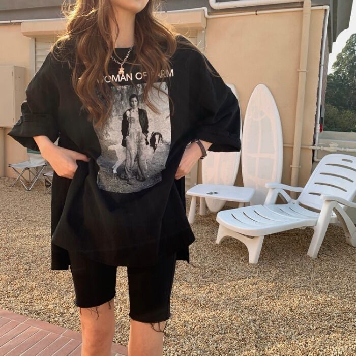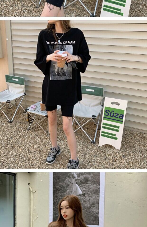 スタンダードプリントルーズTシャツ レディースサマーラウンドネックトップス コットン レトロ 夏物 Oネック kumikum55479362029
