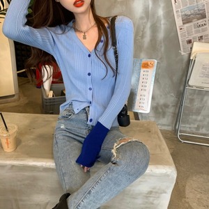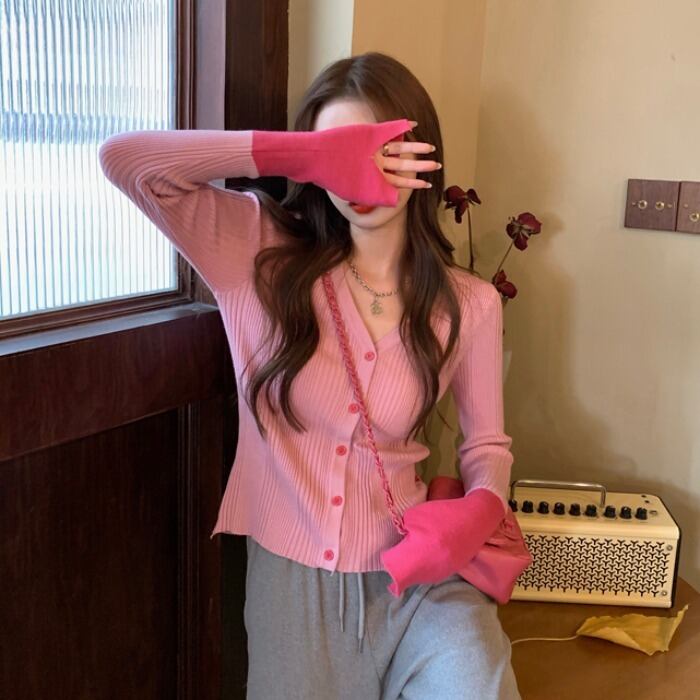 Vネックカラーカーディガンショートトップス レディーススプリングスタンダード薄手ニットセーター ロング レトロ 春物 kumikum60201108542
