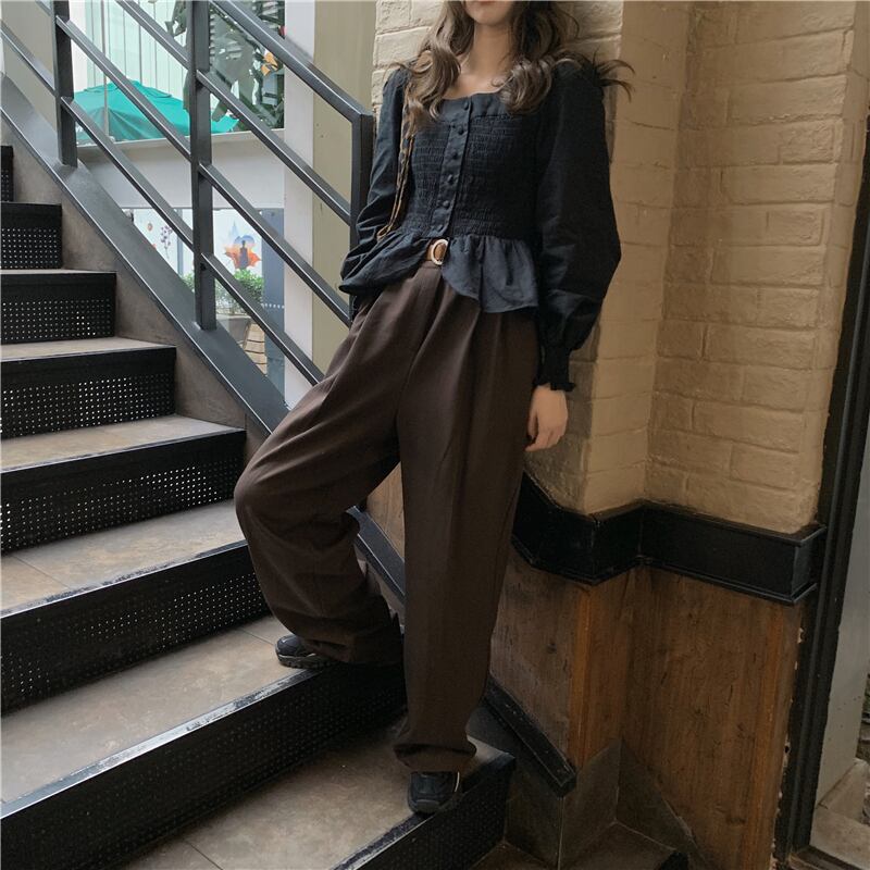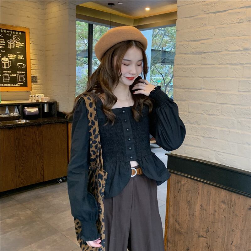スタンダードプリーツシャツ スプリングブラックカラールーズカジュアル ロング レトロ 春物 スクウェア kumikum67800564609