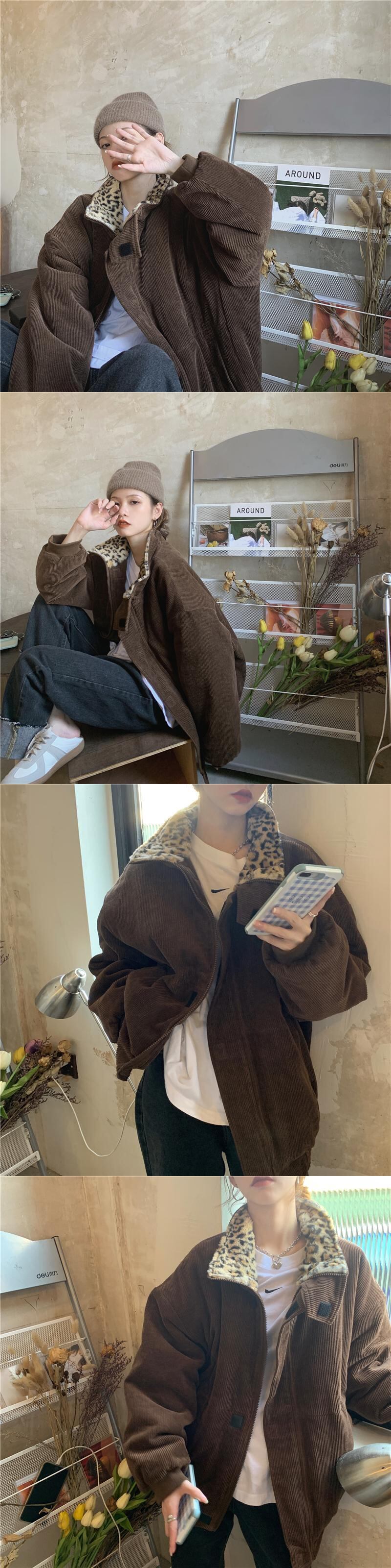 スタンダードコーデュロイジャケット レディースオータムウィンタールーズレオパードカラー レトロ 秋物 冬物 ステッチ kumikum5396306698