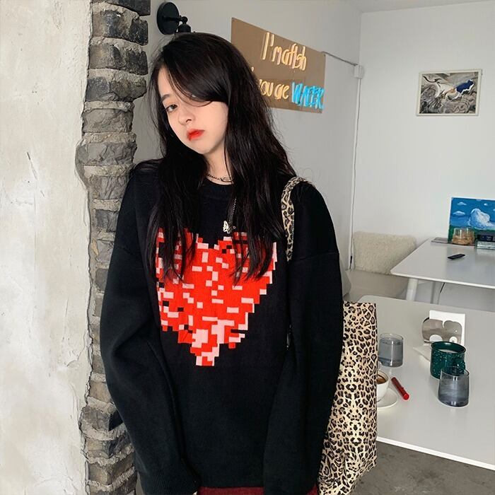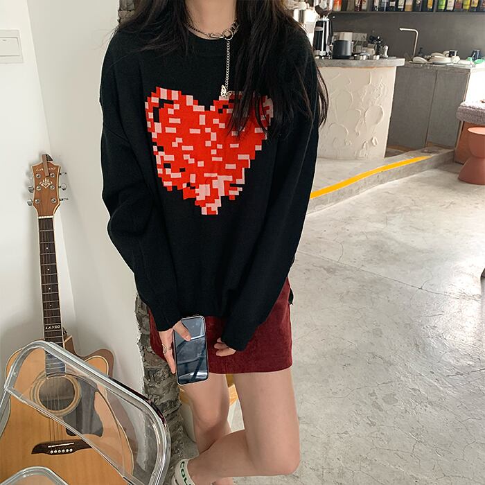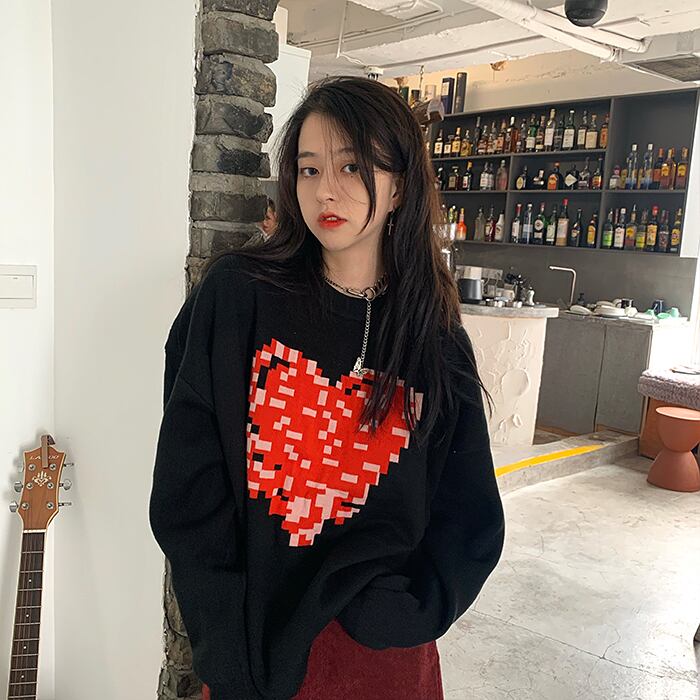 ジャカードルーズニットセーター トップス レディースオータムブラックスタンダードプルオーバー ロング レトロ 秋物 kumikum85406465267