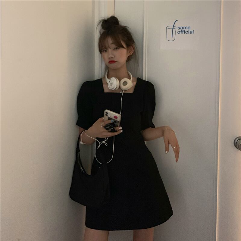 ブラックカラー半袖スリーブドレス サマーウェストスカート ショート ハーフスリーブ 夏物 スクウェア kumikum44800164570