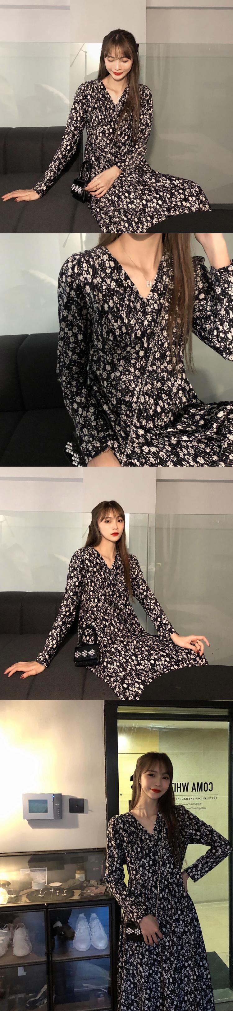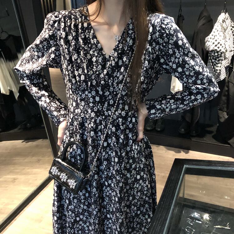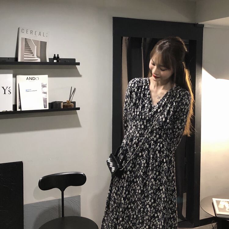 スタンダードフローラルVネックウェストスカート スタイルウィンタードレス 薄手 ロング レトロ 冬物 花柄 kumikum81710264660