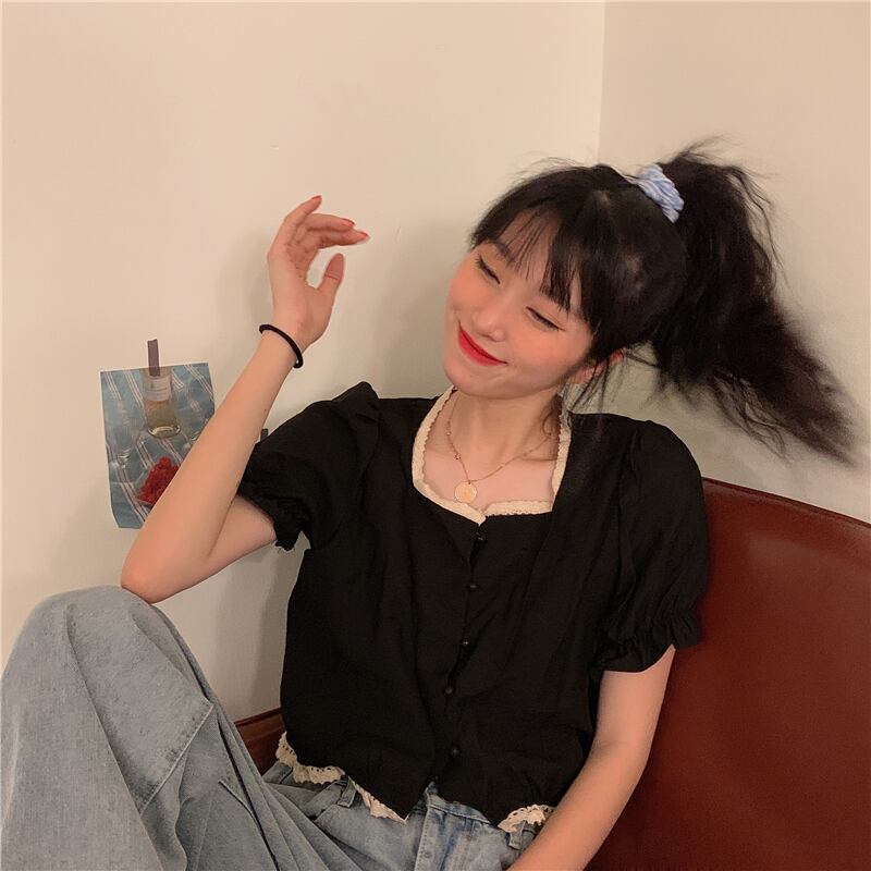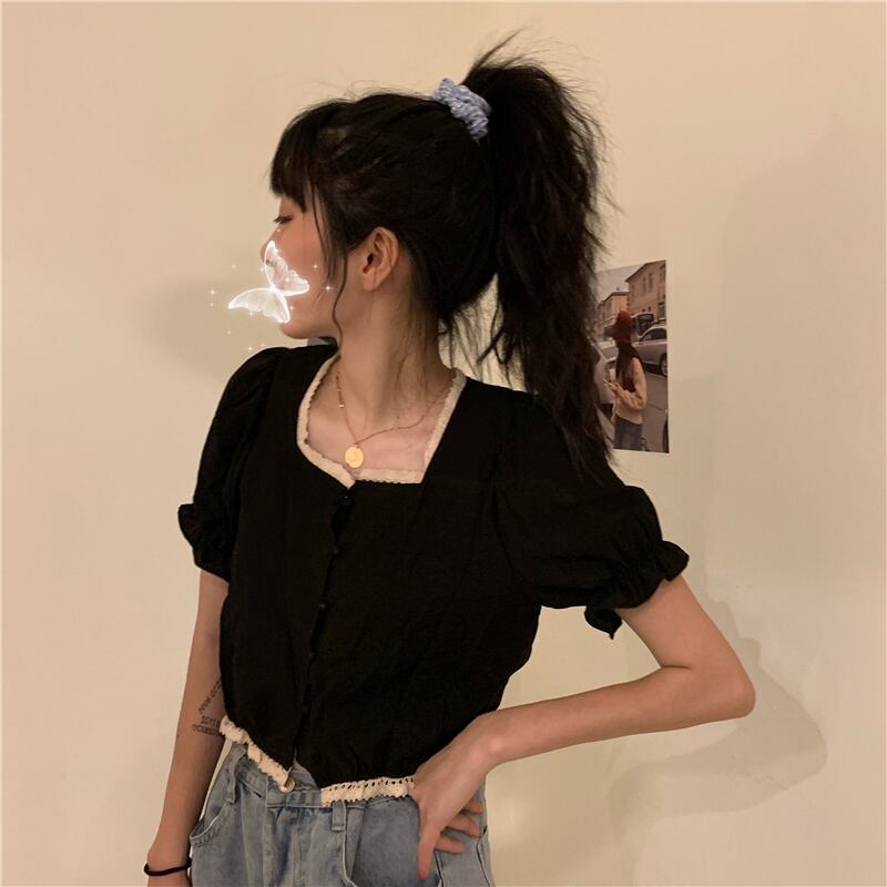 スタンダードレースカラーブラックショートスリーブシャツ サマートップス レトロ 夏物 スクウェア kumikum66831984981