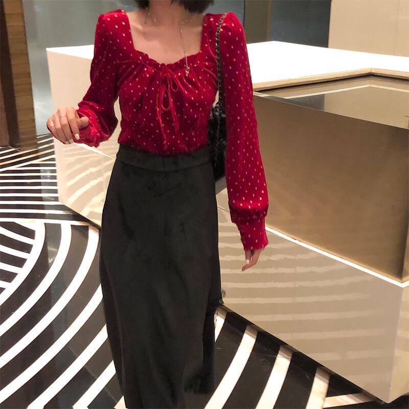 ベルベットスカート ウィンターハイウェストウェストAラインスリットレースブラックスリム 冬物 kumikum91676294891