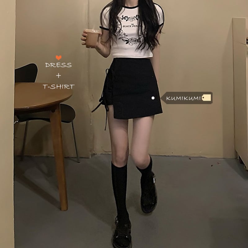 ハイウェストウェスト薄手スカート サマーブラックショートAライン 夏物 kumikum86785252417