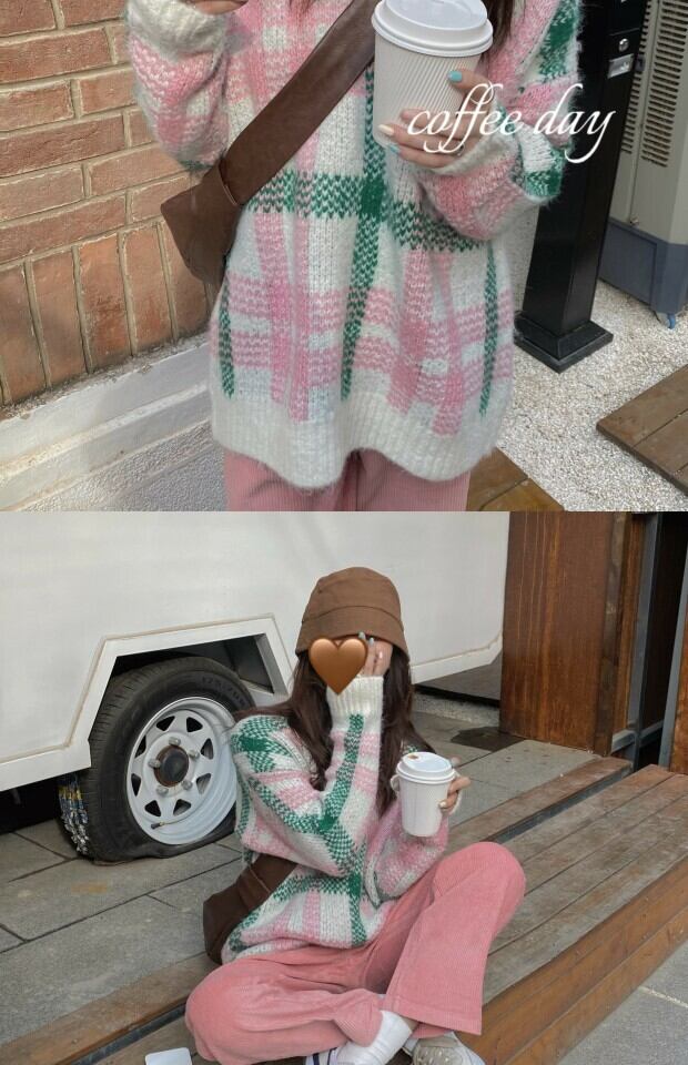 色:カラーチェック柄セーター,ピンクコーデュロイパンツ