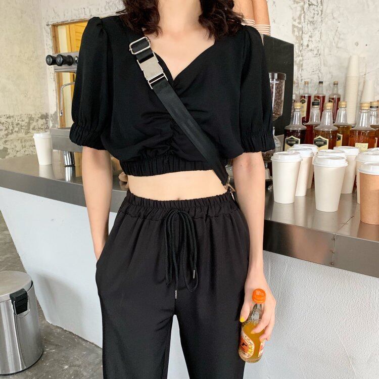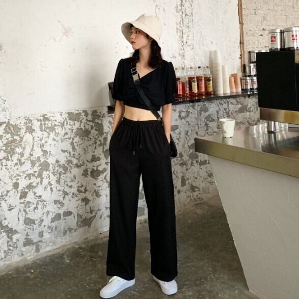 ショートスリーブトップス ショーツ 薄手ウェストワイドレッグパンツ レッド 刺繍 ブルマー ワイドパンツ kumikum68972309807