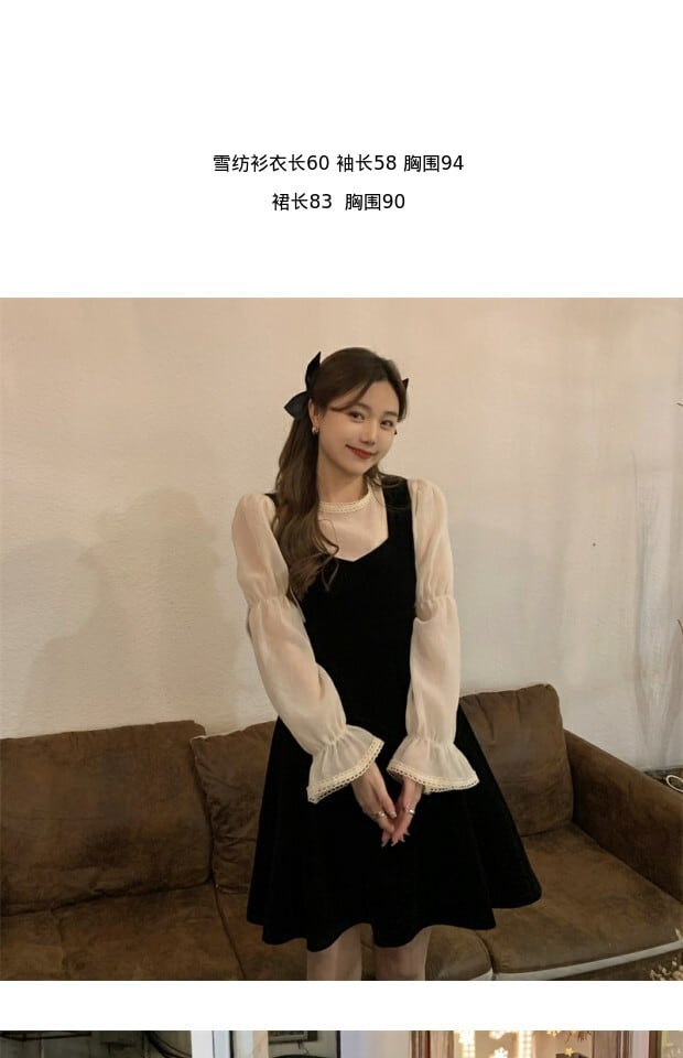 色:白いシフォンシャツ,黒いドレス