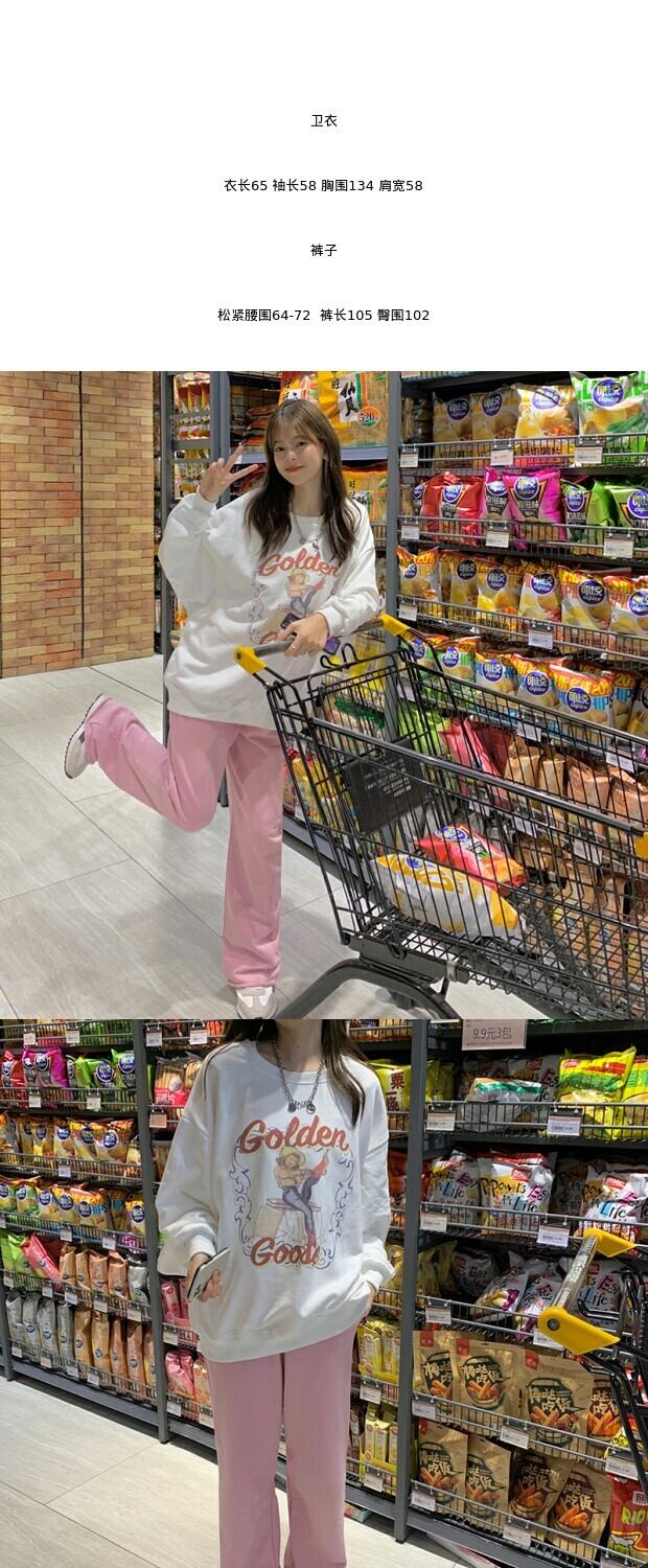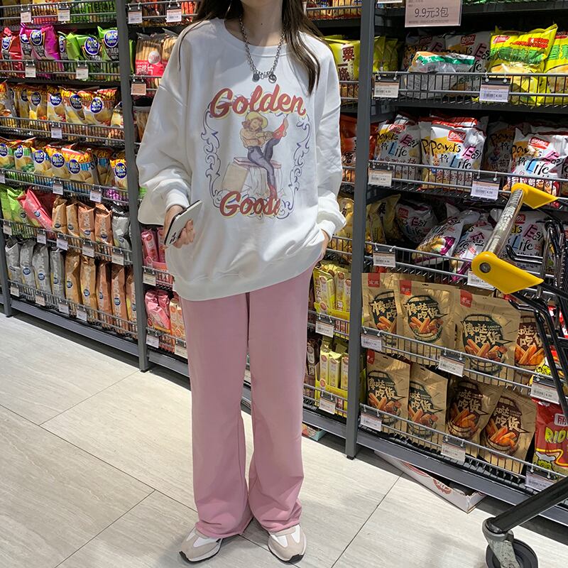 プリントルーズラウンドネックセーター ウィンタースタイルカジュアルパンツ ピンク 冬物 Oネック kumikum45743344348