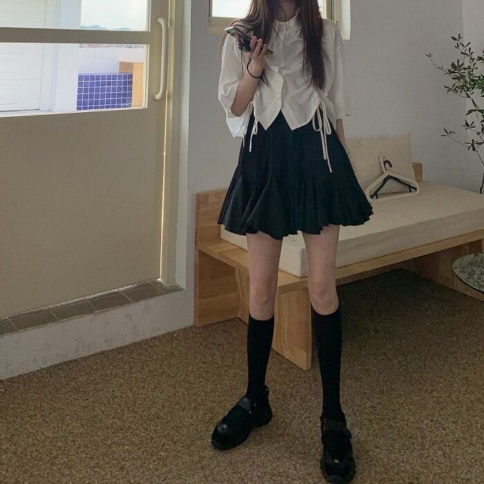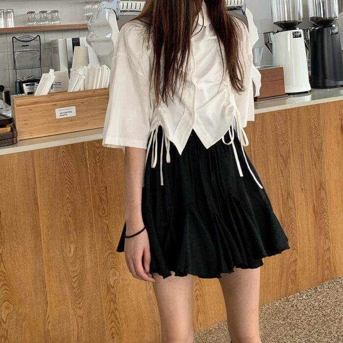 スタイルブラックプリーツスカート サマーハイウェストウェストルーズスリムショートAライン 夏物 kumikum24763212179