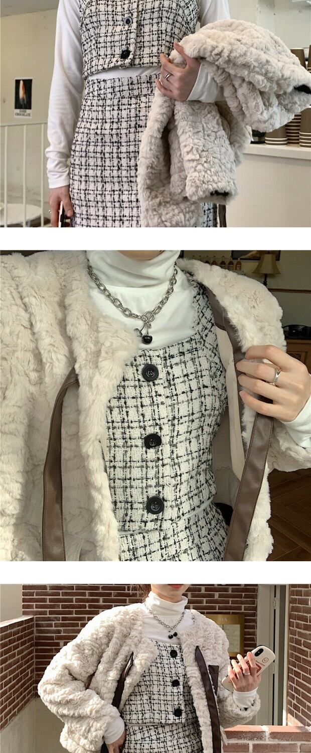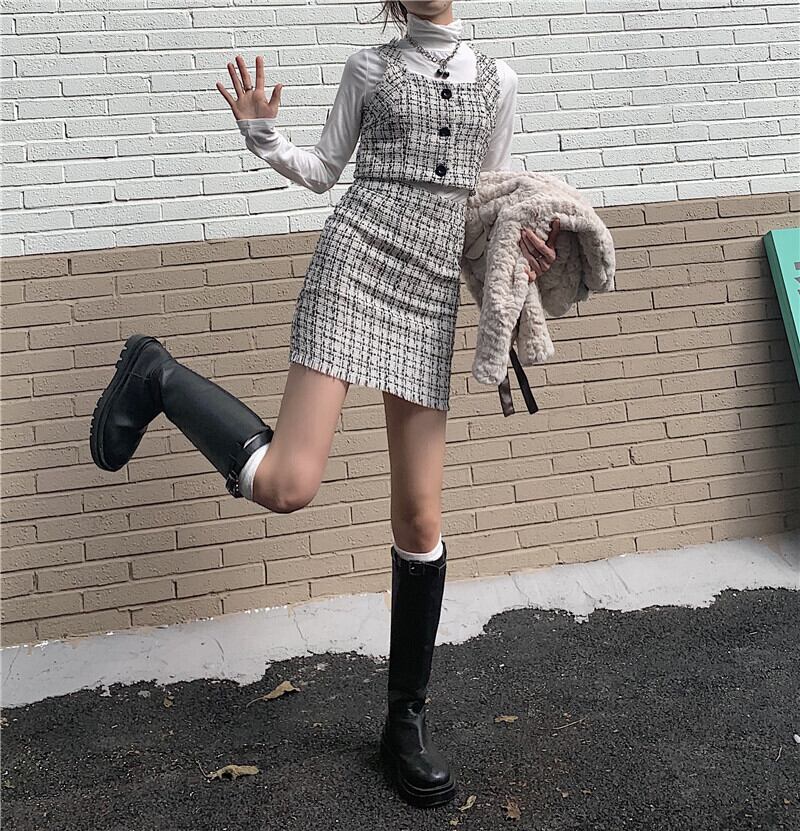 ウールジャケット ウィンターノースリーブショートハイウェスト格子柄スカート 冬物 kumikum55884588730