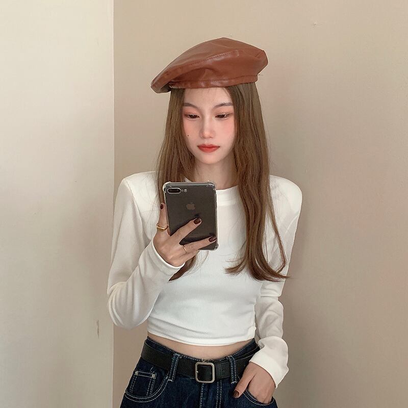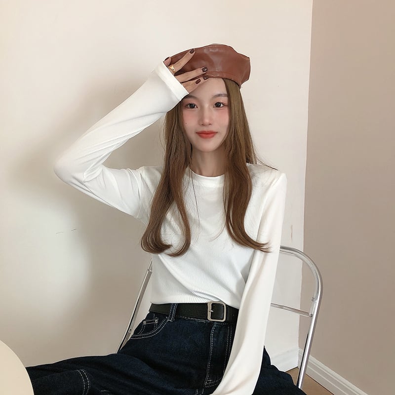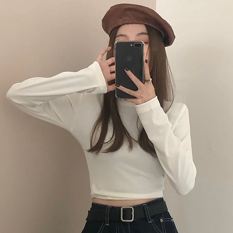ショートスリムソリッド カラーラウンドネックシャツ トップス 長袖スリーブTシャツ ロング Oネック ソリッドカラー kumikum4904215459