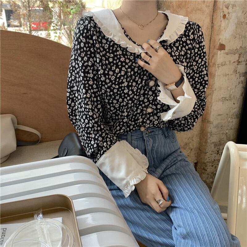 スタンダードフローラルカラーシャツ オータムルーズシフォン ロング レトロ 秋物 花柄 kumikum83192384156