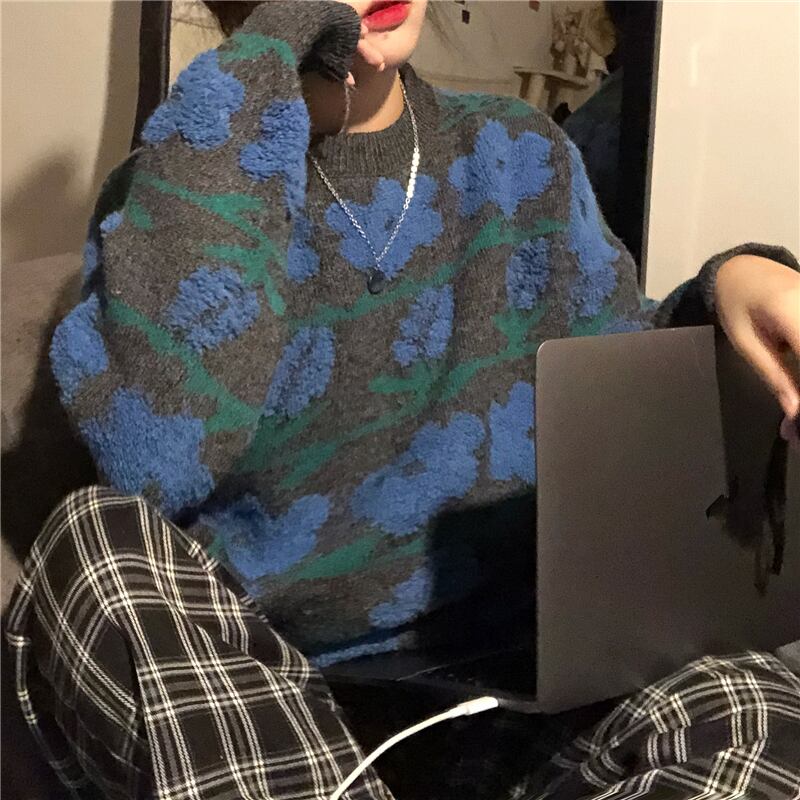 スタンダードFlowerデザイン セーター レディースウィンタールーズスタイルラウンドネックプルオーバー ニットトップス レトロ 冬物 Oネック フラワーデザイン kumikum10206885210