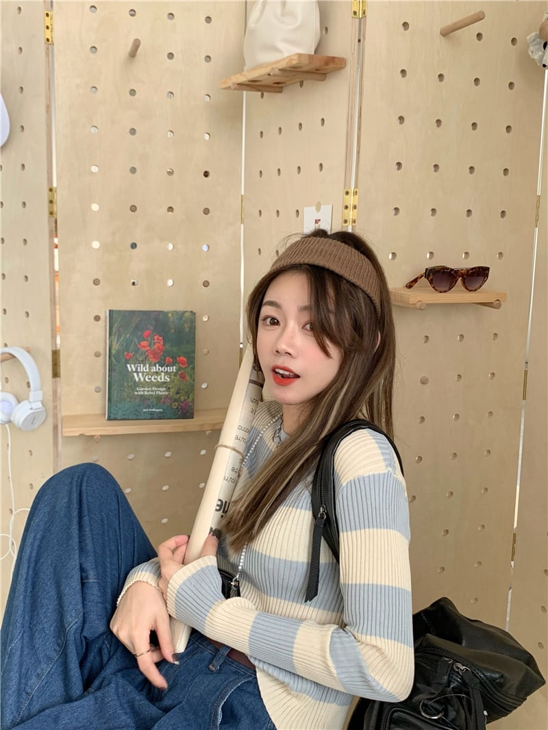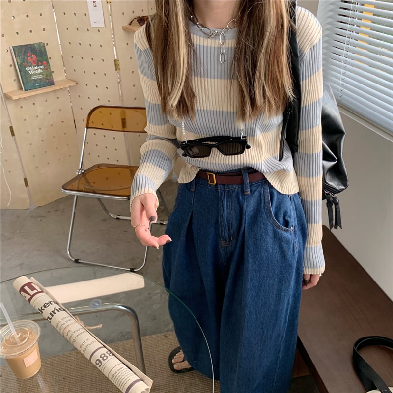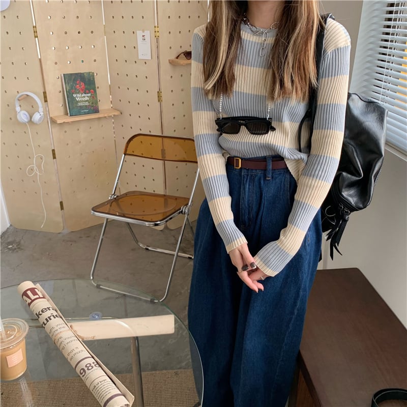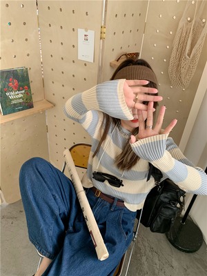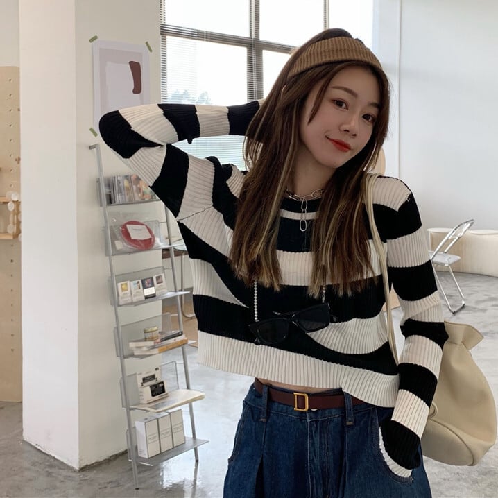 ショートプルオーバー セーター シャツ オータムストライプスリム薄手ニットトップス ロング 秋物 kumikum10096699492