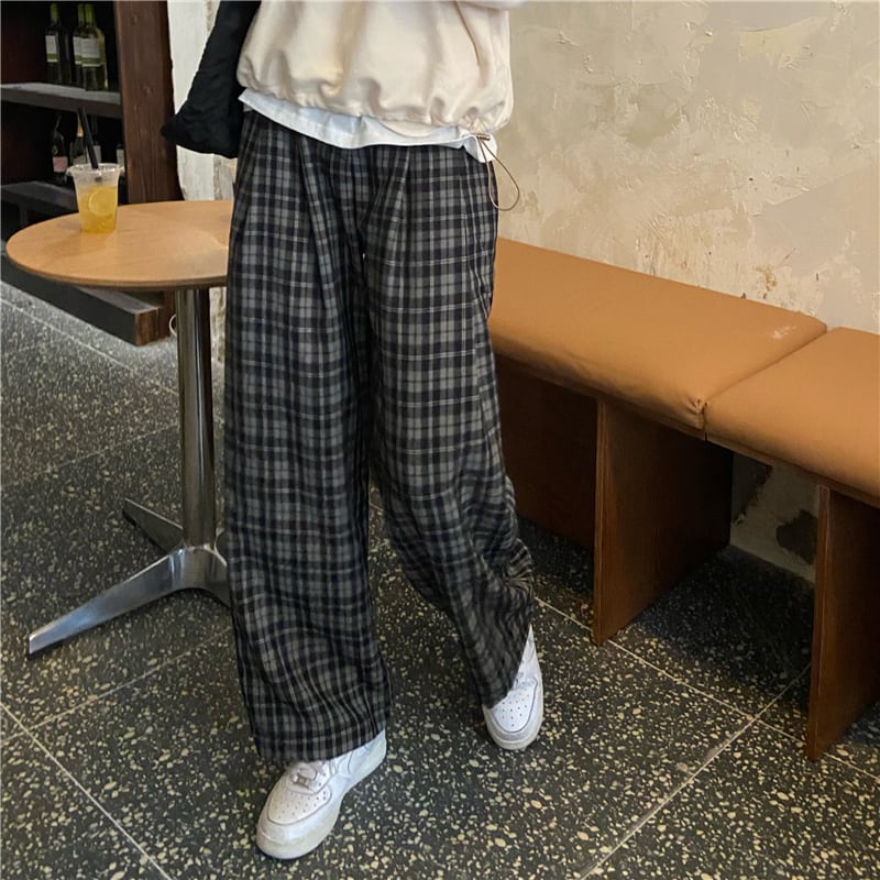 格子柄パンツ オータムルーズスタンダードハイウェストウェストスリムカジュアル レトロ 秋物 kumikum84233259647