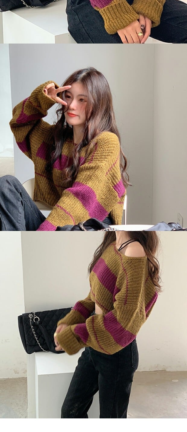 ストライプカラーニットセーター トップス レディースウィンターショートスタイルプルオーバー ロング 冬物 kumikum29649258851