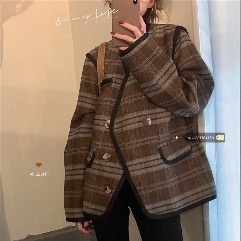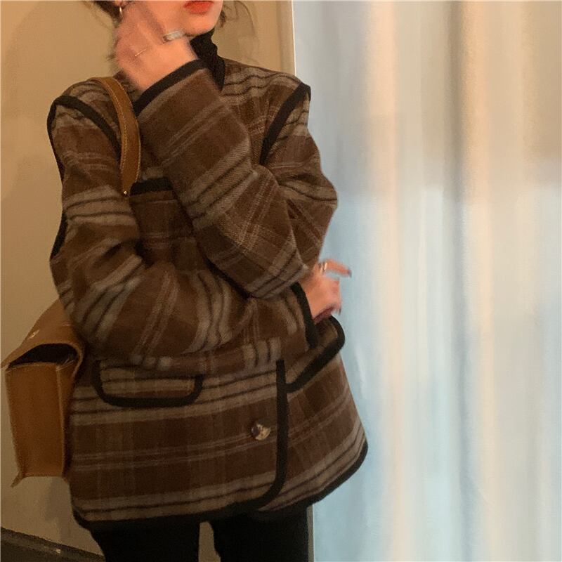 レッドVネックスタンダード格子柄ジャケット レディースウィンタールーズ レトロ 冬物 kumikum15660055421